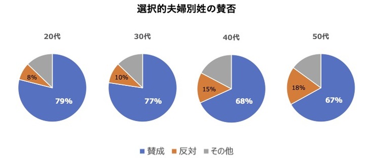 こちらの円グラフは、選択的夫婦別姓に賛成/反対する人たちの比率を年齢別に表したものです。20代、30代だけでなく、40代や50代でも賛成多数であることがわかります。(47都道府県「選択的夫婦別姓」意識調査)