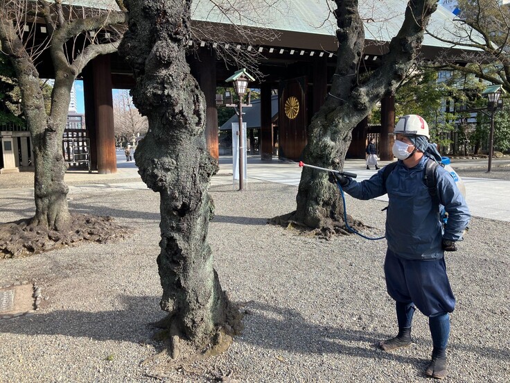 樹木の病害となる菌の付着を防ぐため、殺菌剤を散布します。
