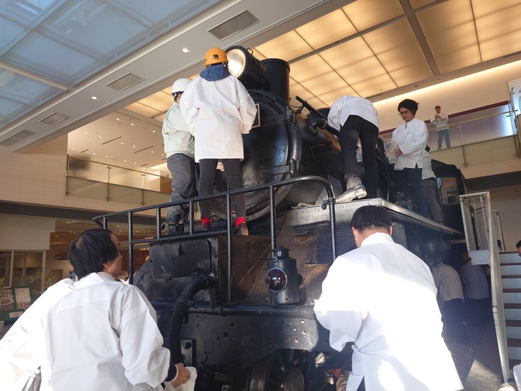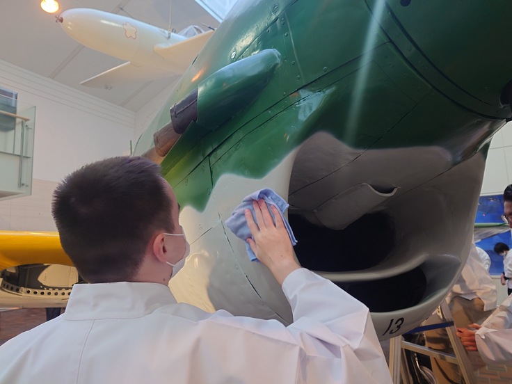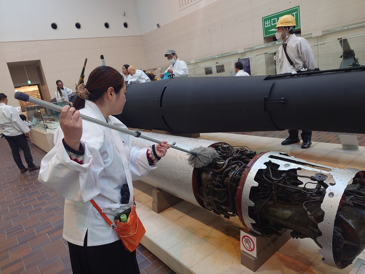 遊就館開館へ向けて~崇敬奉賛会青年部「あさなぎ」による大型展示物の清掃奉仕の様子