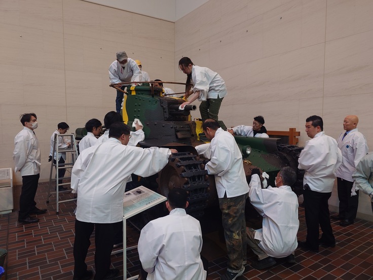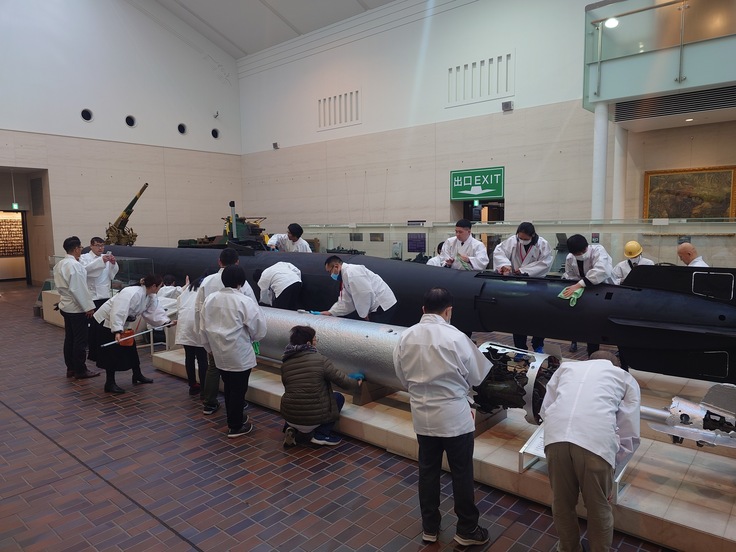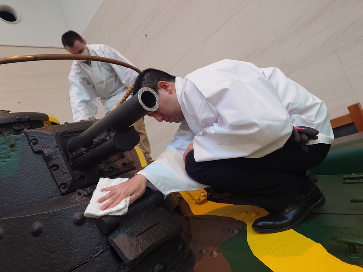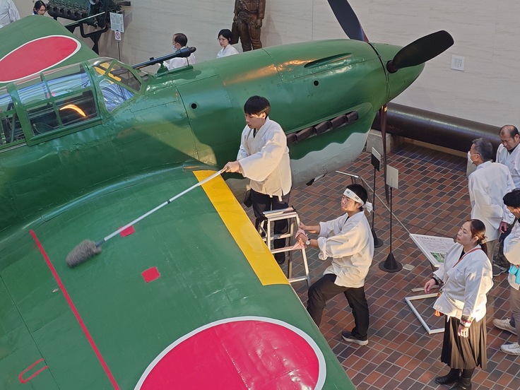 開館に向けて、本日12月22日(日)に靖國神社崇敬奉賛会 青年部「あさなぎ」による大型展示物の清掃奉仕が実施されました。