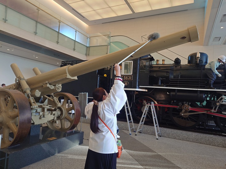 靖國神社遊就館職員の監督・指導のもと、各展示ごとに使用する道具を変え、細心の注意をはらい実施しております。