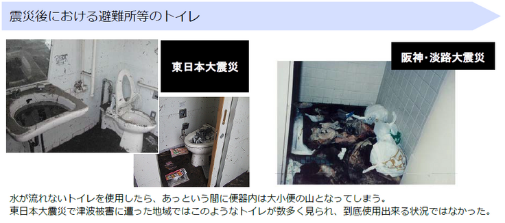 特に東日本大震災では、仮設トイレが避難所に行き渡るまでに4日以上を要した自治体が29自治体のうち66%であったと言われております。