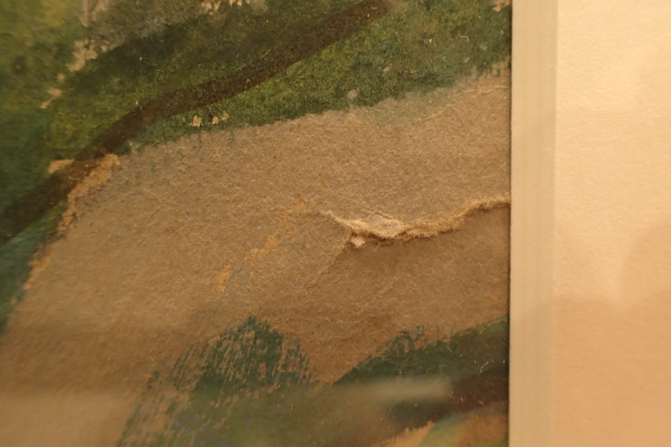 この作品は制作から長く時間が経ったために、絵具の剥落や、剥落につながる亀裂、浮き上がりが所々に見られます。また、額に入れる前の発生と考えられますが、本紙に破れや画鋲の跡があります。