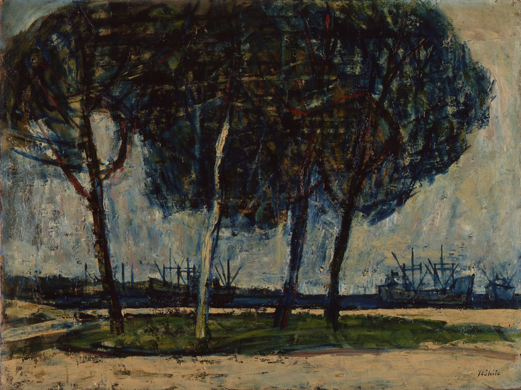 横浜で活躍した柴田善登(しばた・よしと、1910-1995)の油彩画。本作は関東大震災(1923年)の復興事業として建設が進められ、1930年に開園した山下公園を描いた作品です。4本の木を画面に大きく入れ、視線の前方に海を臨む光景で、湾には何隻もの船が停泊しています。鬱蒼と生い茂り、力強い生命力を感じさせる木々の葉や、幾色も使って表された背景の空のマチエールが印象的な作品です。