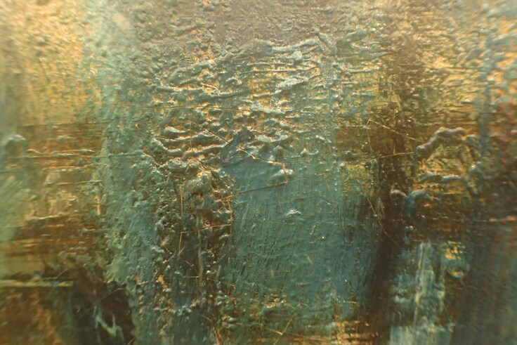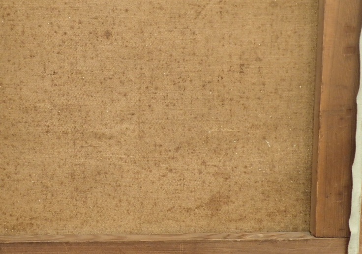 本作も制作から時間が経ち、絵具の浮き上がりや亀裂、穴が見られます。画布(キャンバス)の裏には染みが見られます。裏面のキャンバスと額を固定する釘の固定不良も見られます。鉄製の金具は錆びも招くので、ステンレス製のものへの交換が望ましいです。