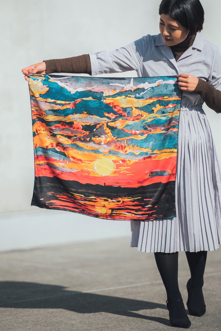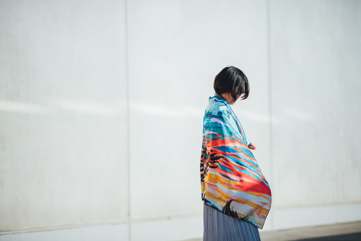 ※原画をデータにして生地へ印刷する製法をとっているため、色の出方は女性モデルが広げて持っている写真が実際に近いです。お使いの画像再生環境により実際の色との見え方に差が出ることをご了承ください。