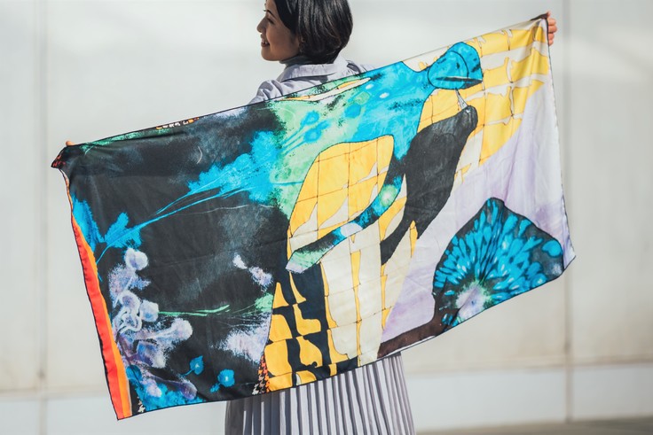 シリアのヒヤーム・サルマーン氏の絵画を日本の技術でストールとスカーフへ!大阪の繊維メーカーが開発した再生ペットボトル42%の生地を使用し大阪の福祉作業所で縫製します。~YDY-BRIDGEプロジェクト~