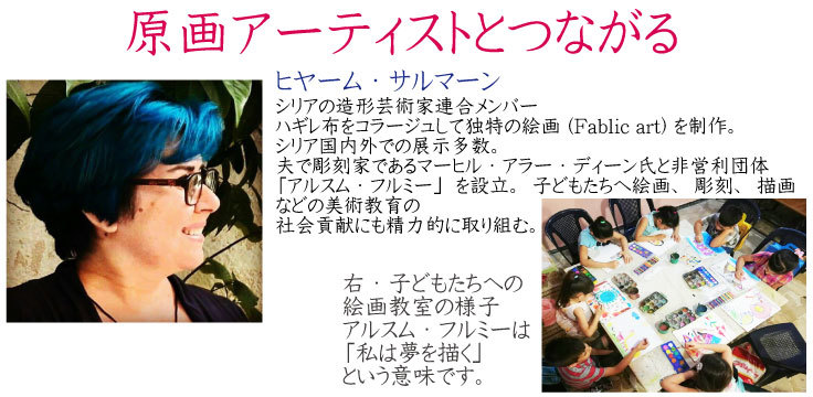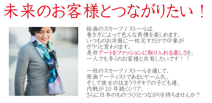 一枚でも多くのシリア人アーティストの絵画をスカーフ・ストールという形で、ご紹介したいです。同時にシリア西部の町ラタキアの子ども達への美術教育へ取り組むヒヤーム・サルマーン氏が運営するアルスム・フルミー協会のことも紹介してまいります。
