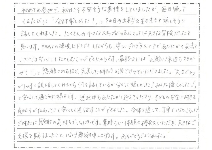 サポーターの皆様からの支援を活用して参加してくれたお子様・保護者の方より感想が届きました。
