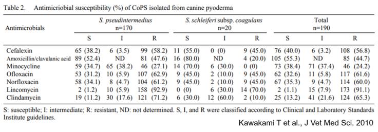 画像は、Kawakami T et al.(J Vet Med Sci. 2010)の論文の表ですが、R(耐性:薬が効かない)の割合がどの薬も高い状況です。