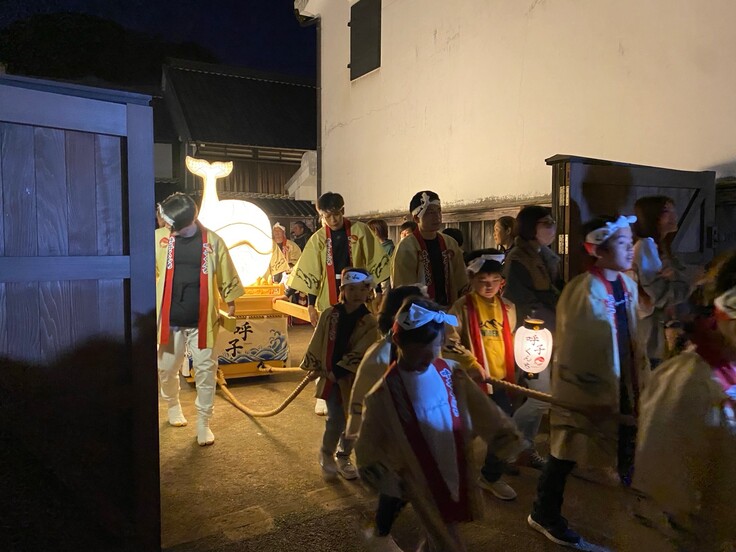 今年は、時期をずらしたことにより海上の安全性確保が懸念され、海からの『親子鯨の弁天参り』を断念することとなりましたが、陸路で弁天参りを行うことにより夕闇に浮かび上がる親子鯨となり、巡行を見ていただいた皆様には幻想的な風景を楽しんでいただけたと思っております。