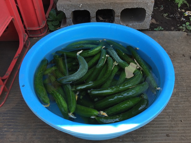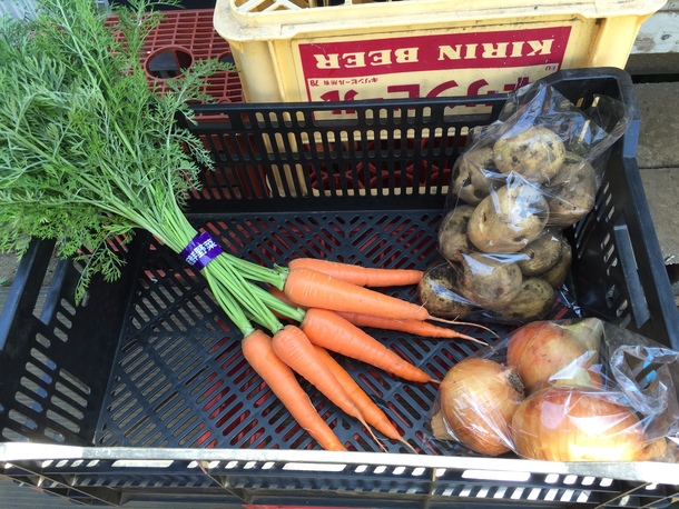今回いただいたのは、ニンジン、ジャガイモ、タマネギ、キュウリ…オマケに特大サイズのダイコン(※画像参照)までいただきました。