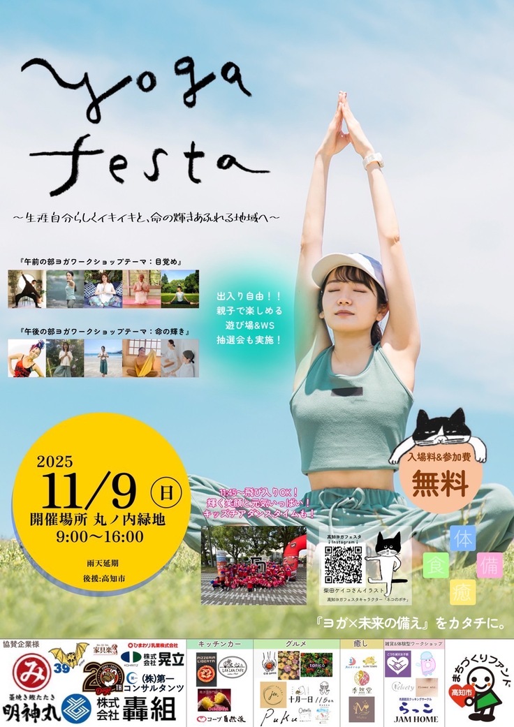 今年も高知ヨガフェスタ2025を開催いたします!11月9日(日)9:00〜16:00に、高知城の丸ノ内緑地にて開催します♡