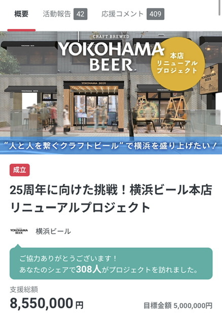 7月14日から始まった「25周年に向けた挑戦!横浜ビール本店リニューアルプロジェクト」へ向けたクラウドファンディングですが、409名の皆さまからご支援頂き、ネクストゴールの目標800万円を達成!最終結果、855万円のご支援を頂きました。