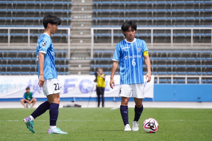 横浜FCユースは4-4-2の布陣で、中央にトップチームへの2種登録が発表されたNo.6 高橋友矢選手と前線にNo.9 庄司啓太郎選手、No.23 前田勘太朗選手の3名を配置。