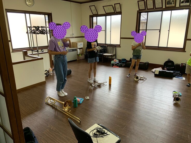 現在は20名近くのメンバーが集まり、地域の公園や町内会館をお借りして活動しています。町内会館の2Fでブラス(管楽器)パートの基礎練習、1Fでパーカッション(打楽器)の基礎練習&譜読み(曲のリズム練習)を行っています。(画像を加工しています。全員の了承を得てからの完全公開予定です!)