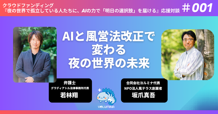 現在挑戦中のクラウドファンディングの応援コンテンツとして、AIや夜の世界に関わるゲストの方とヨルミナ代表の坂爪が対談する「応援対談」を、定期的に公開してまいります!