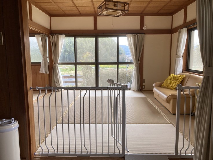 和室寝具はシングル布団×3なのですが、掛布団はダブルを一つ用意しています。お子様と眠るとはみ出てしまいがちなママの背中がしっかり包まれるようにダブル1としました。また、少し離れても目が行き届くように和室と洋室の区切りはベビーゲート+カーテンとしました。