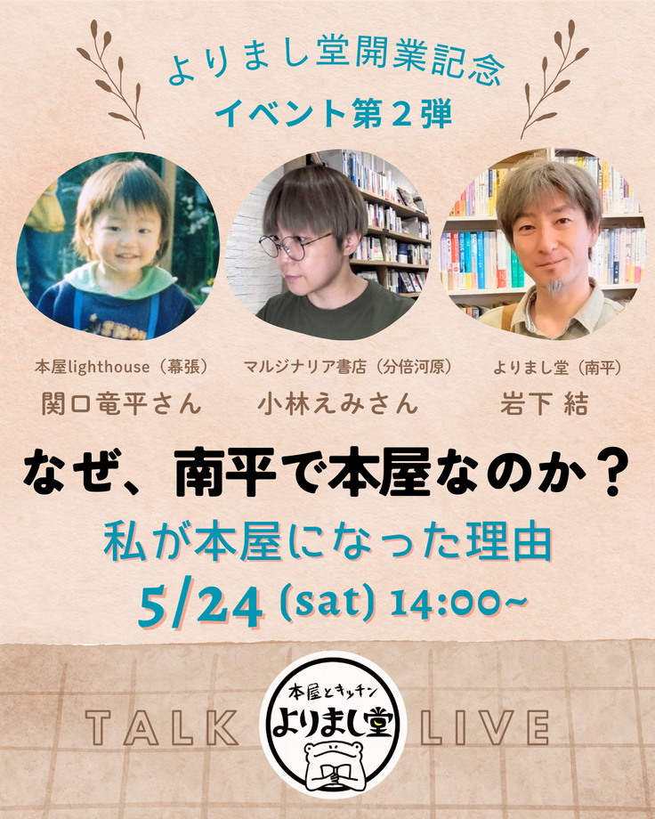 開業記念イベント第2弾として、5月24日(土)に「なぜ、南平で本屋なのか?〜私が本屋になった理由」と題したイベントを開催します。