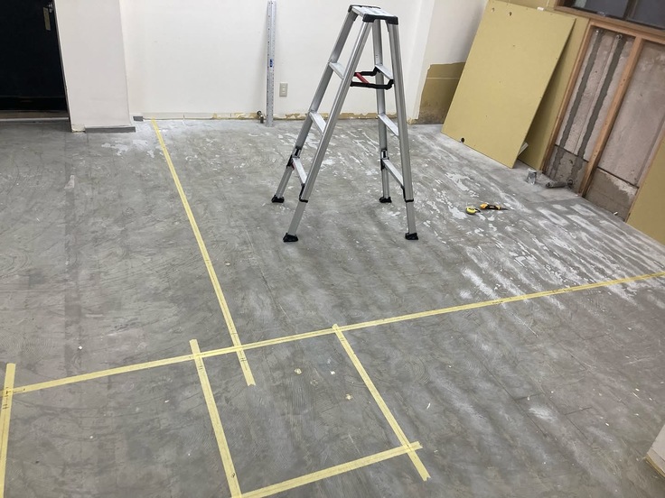 下の写真のマスキングテープの左の四角がお客様用洗面所、右の四角はレジスペース。