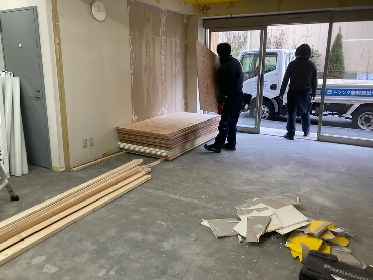 床張りのクッションフロアは剥がされ、奥の壁もボードを張り直してもらいました。