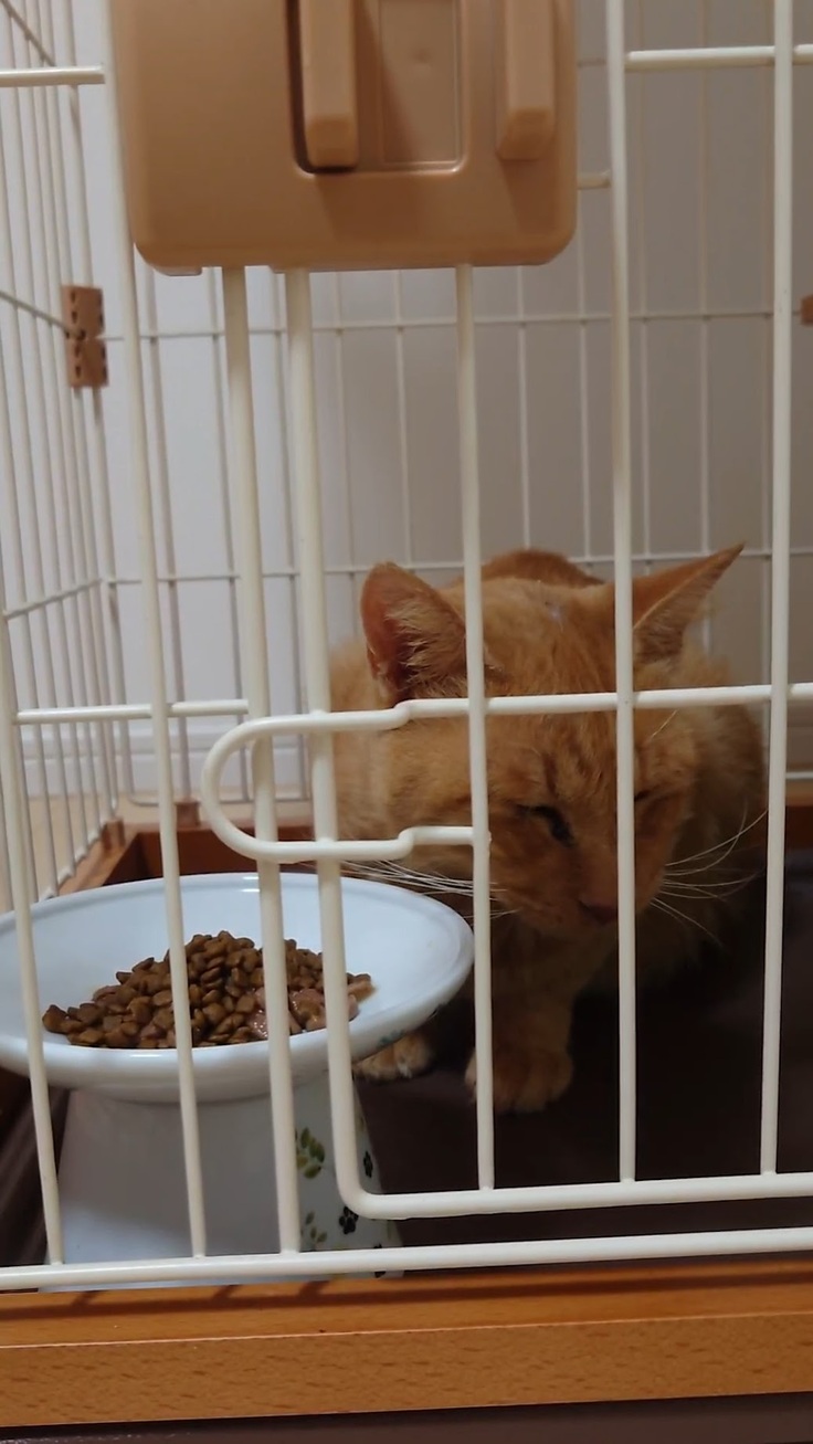 🐈うちに来て12日目。ヨッちゃんが触ることを許してくれたので、クレートの前でごはんを食べる練習を始めました🐈