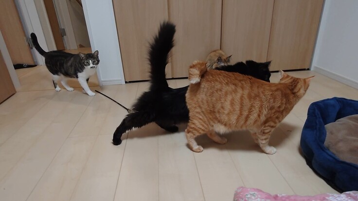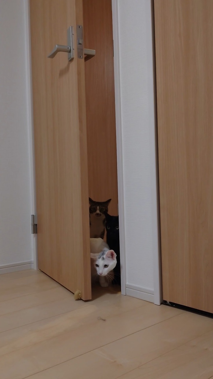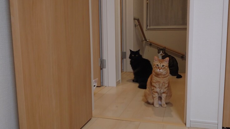 一気にヨッちゃんの部屋から散る白猫のフリーザとキジ白のでんでんと茶トラの虎太。