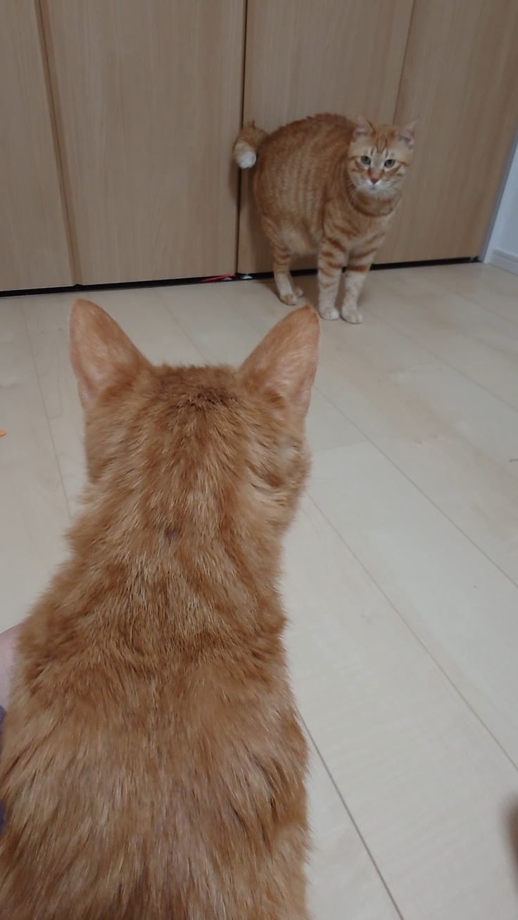 仲良くも仲悪くもないふたりだけど茶トラ同士気になるのか近くにはいる。