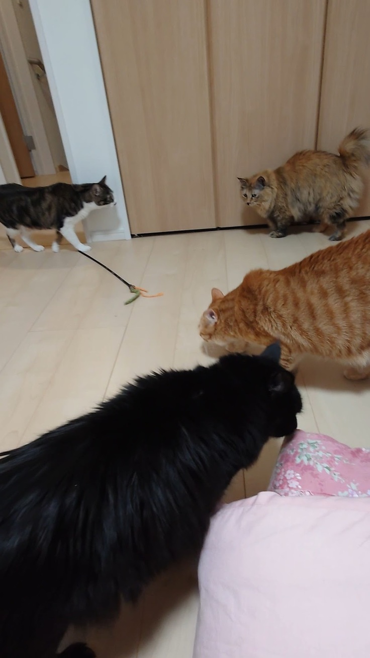 🐾ヨッちゃんを抱っこして待っていたら、部屋に入ってきてくれた猫たち。🐾