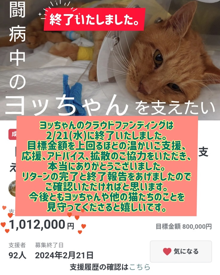 🎊2/15(木)にヨッちゃんのクラウドファンディングが達成、2月21日(水)23:00で終了いたしました😺12月24日(土)にヨッちゃんのプロジェクトを公開させてもらってから約2ヶ月。ヨッちゃんのために目標金額を大幅に上回るたくさんの温かいご支援・応援・アドバイス・拡散のご協力をいただき、本当にありがとうございます😭