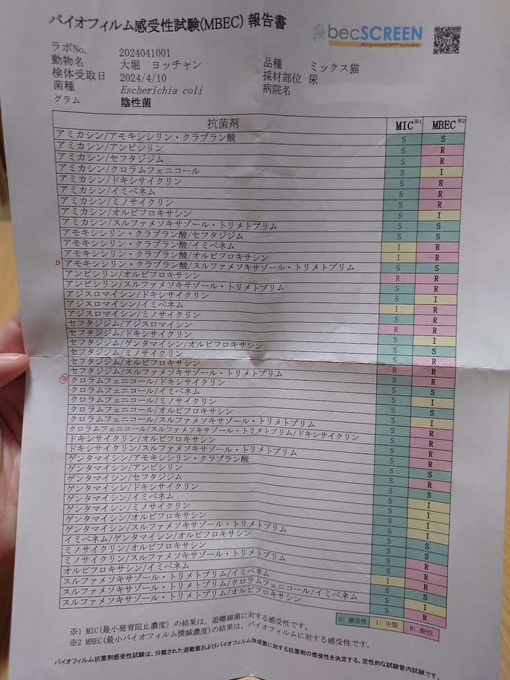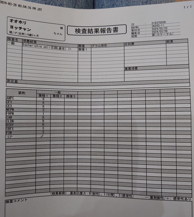ヨッちゃんの効く薬の種類を調べた外注検査の結果が戻って来てRはヨッちゃんに耐性がついていて効かない薬、Sは効く薬。でも効くはずの薬を飲んでいるはずなのに尿路感染の細菌が残っていて効果が薄いことが発覚したヨッちゃん。
