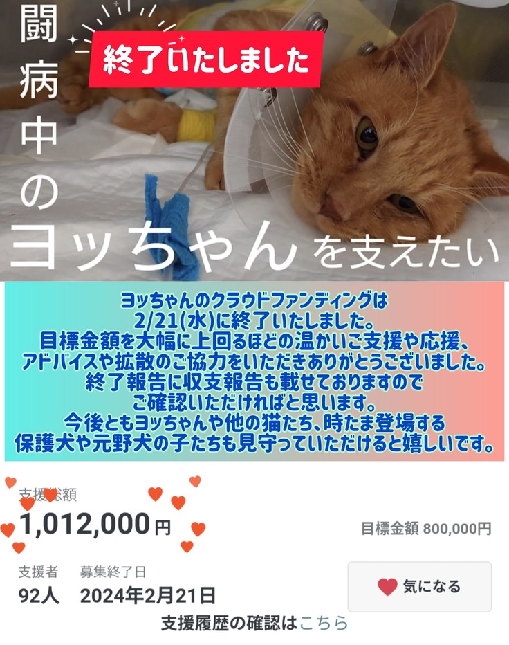 🎊2/15(木)にヨッちゃんのクラウドファンディングが達成、2月21日(水)23:00で終了いたしました😺12月24日(土)にヨッちゃんのプロジェクトを公開させてもらってから約2ヶ月。ヨッちゃんのために目標金額を大幅に上回るたくさんの温かいご支援・応援・アドバイス・拡散のご協力をいただき、本当にありがとうございます😭