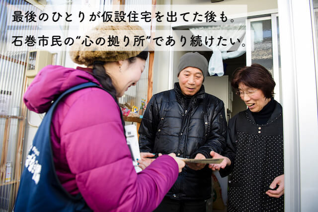 石巻市内の仮設住宅向けに、無料情報紙「石巻復興きずな新聞」を発行・配布する。情報発信を通した住民の自立促進や、ボランティアによる訪問・傾聴・見守り活動を通した心のケアに取り組む。「最後のひとりが仮設住宅を出るまで」を目標に、前身の「仮設きずな新聞」を引き継いで、2016年6月に創刊。仮設住宅が解消された今も、復興公営住宅を中心に活動継続中。