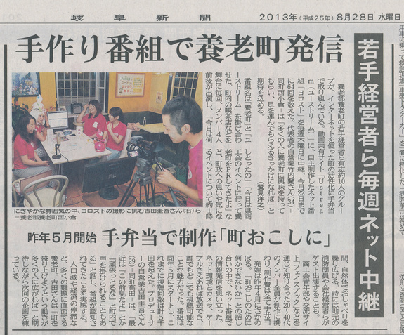 そんな深い歴史と美しい自然が残る岐阜県養老町で、約3年前から町づくりと活性化のための活動をしているのがわたしたち、NPO法人ヨロストです。メンバーは、会社員、自営業者、大学生とさまざま。企画、取材、撮影、配信まで全て自分達で運営するインターネット番組を毎週生放送で2年間続け、町民目線で地域の話題を伝えてきました。