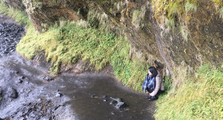 アイスランドにある滝の裏で自然の一部になりきっている時の写真