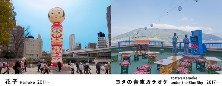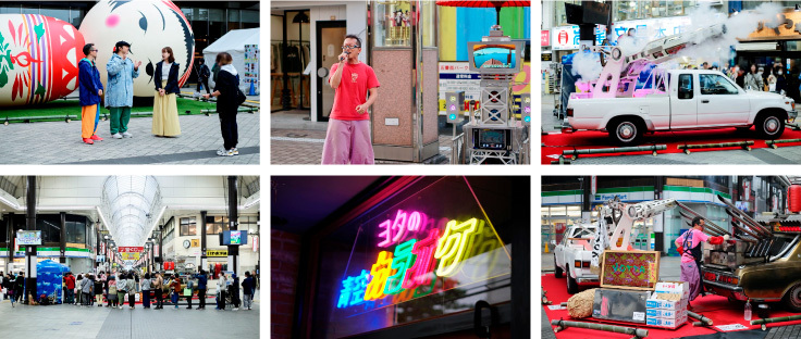 JR大分駅の北口前広場では《花子》が真正面に横たわり、ガレリア竹町ドーム広場には《金時》《穀》が昼夜ネオンを光らせ、府内町5番街では《⻘空カラオケ》がゲリラ的に開催され、駅前の地下道には《くじらのカーニバル》が待ち構える…
