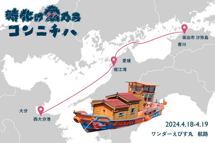 ようやく整備を終え、これまで坂出市近海でしか運航してこなかった《ワンダーえびす丸》が、今回の大分県での展示に向けて、はじめて香川県から出て、香川~大分間の瀬戸内海を横断しました。