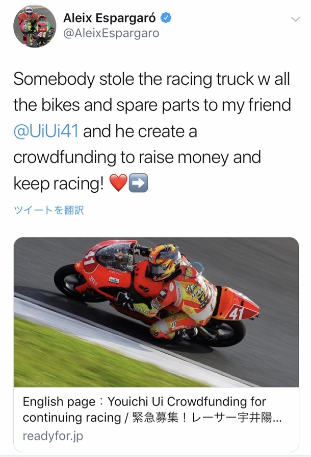 MotoGP rider Aleix Espargaró posted my difficult situation and our crowdfunding in his twiiter.