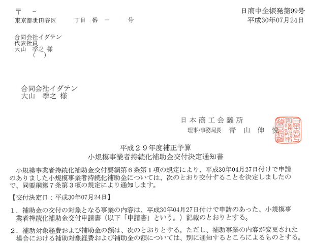 ②日本商工会議所 小規模事業者持続化補助金 『補助金交付決定通知書』 届きました(採択先として決定との報告は頂いていましたが、改めて通知書が届きました)。