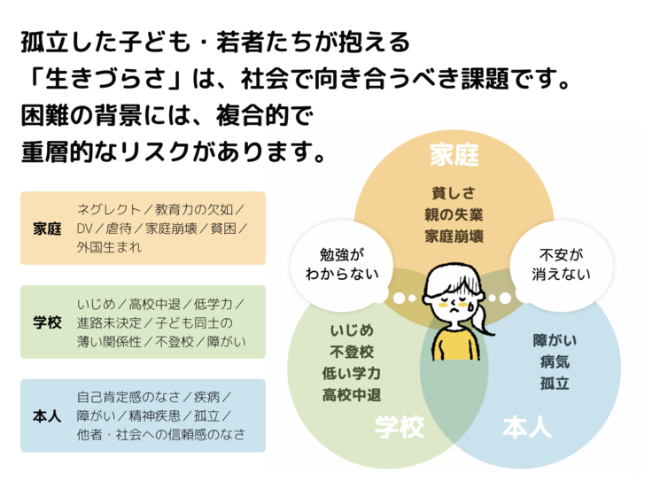 二人は支える親や家族を持たない若者でした。「余裕がないです。自分の体を張ってでもお金がほしい」、こう話した10代の女性は、両親の離婚後、生計を祖母のパートと女性のアルバイトで支えていました。 貧困の多くは孤立も伴います。
