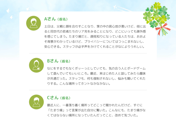 たまり場に通う方々からは以下のような声が良く聞かれます。