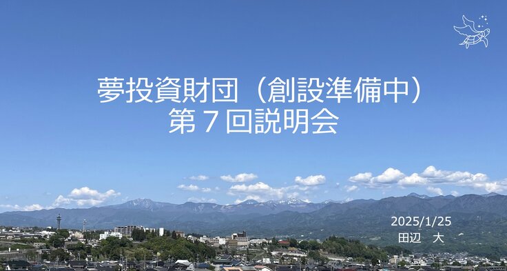 一般財団法人夢投資財団(創設準備中)第7回説明会を2025/1/25(土)11:00-12:00でzoom開催します!