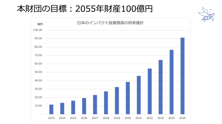 本財団は世界のインパクト投資市場規模の成長見通しと同値の年18.8%成長を続け、30年後の2055年財産100億円の目標とします。
