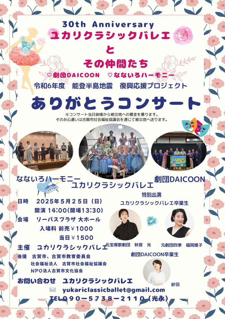 この能登半島地震復興応援は、今までになく自分事として感じる地震でした。遠く離れた能登地方の地震 令和6年1月1日私が住む古賀市にも津波注意報が発令し津波災害警戒区域 警戒4避難指示がでました。ユカリクラシックバレエは古賀市でも海に近いところに位置し、夕日が美しい地域にあります。私事ですが、介護中の母を どうやって避難させようか、酸素ボンベの電源は?どうやって母を車に乗せて避難しようか?頭の中がぐるぐる、まわりました。母にも『津波が来るかも?頑張って車に乗って避難するよ』と動転していた私を振り返る今の自分がいます。過去東日本大震災。熊本地震。北部九州豪雨災害。と子どもたちとコンサートを行ってきましたが今までになく身近に感じた災害です。先日もNHKあさイチで古賀市出身の博多大吉さんも被災地に訪れ、まだまだ復興していない様子。そこで頑張っている方々を取材されていて、心にひびきました。