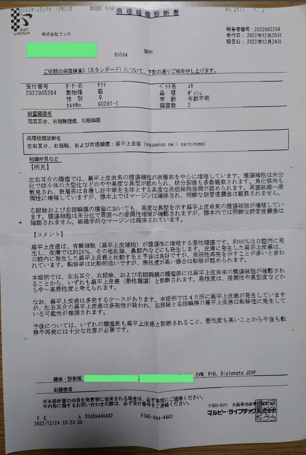 12/24 (土)、一時退院前に外注に依頼していた病理組織診断書が届きました。