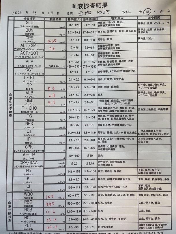 4月10日、血液検査とエコーをしてもらうため通院しました。
