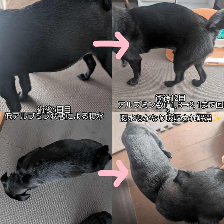 ゆっけは2本の門脈体循環シャント(奇形の血管)を絞扼したけど、癲癇防止のため術前からの処置のおかげで発作も無く。肝機能がかなり悪化していたため低アルブミン血症は起こしたけど成分輸血で乗越えてくれました💉でも退院から数日は腹水でお腹ぱんぱん💦心配でした…