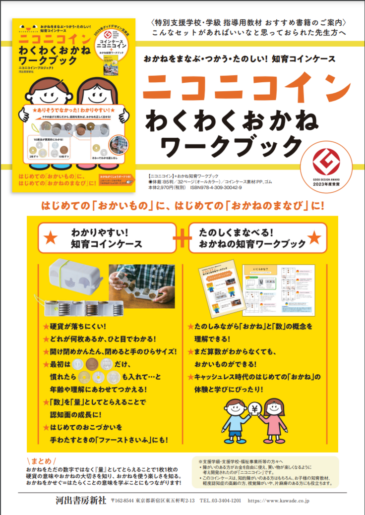 河出書房新社が、健常のお子様も、障害のある人も共に学べるワークブックとニコニコインをセットにした