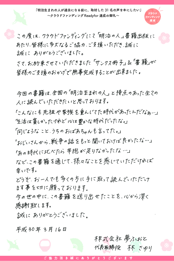「明治の人の書籍出版」が、皆さまのご支援のおかげで無事にプロジェクトが完了致しましたことをこちらにご報告させていただきます。