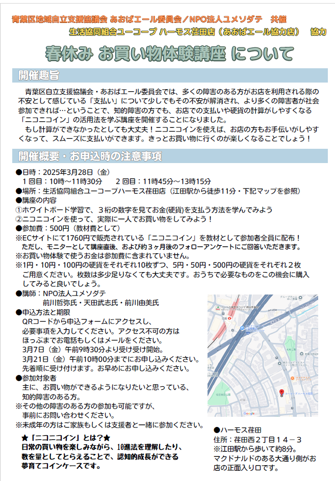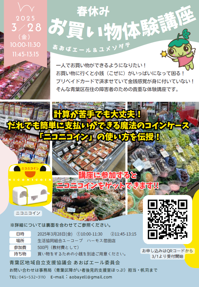 青葉区自立支援協議会あおばエール委員会主催とNPO法人ユメソダテの共催で、3/28(金)春休みお買い物体験講座を開催します!障害のある方にお集まりいただき、その場でホワイトボードと現金とニコニコインを使って、お金を支払う練習をします。30分も練習すると多くの人は使えるようになりますので、その後すぐに、会場の生活協同組合ユーコープハーモス荏田店で、お買い物体験をして頂きます。自分でできる!は自信と意欲を産みます!